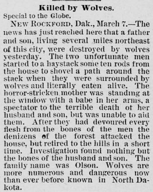 The wolf attack that killed an Olson father and son near New Rockford, North Dakota, was reported in the Saint Paul Daily Globe on March 8, 1888. The article described the incident as occurring on a farm, where wolves devoured the victims, leaving only their bones, and noted it was covered in a North Dakota publication the day before (March 7). This matches historical accounts of the event, including confirmations from sources like The Westerner blog and archived wolf attack compilations.